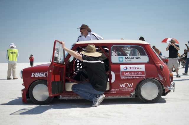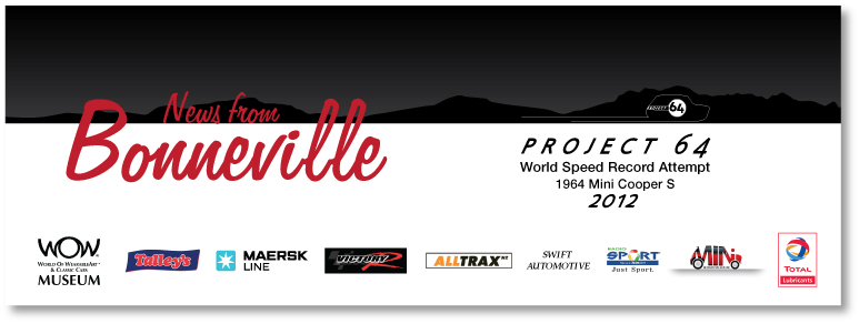 Hello and welcome to the first email update from the Project '64 Bonneville Speedweek Record Attempt. We're not on the Salt yet but we wanted to make contact now before we're all in the USA. The first of the team members are in Los Angeles picking up the Cooper S from Maersk Line who carefully shipped it to LA for us. Others will be following in the next few days. We'll be driving from LA to Salt Lake City, Utah where pick up our RV's (camper vans and caravans) before heading on to Wendover, Utah where we will set up camp on the flats next to the Salt Flats. (Here) On the 9th and 10th of August we'll be going through Tech Inspection and sorting out any fine tuning of the car before Rookie Orientation on the 11th just before racing begins. We'll try to send an email update each day, hopefully with photos from the day if our internet signal is good enough. You can also follow our progress from Facebook: https://www.facebook.com/ProjectSixtyFour We'd like to say thanks to our sponsors and all our supporters, without whom we would never have got this far. We greatly appreciate you help. Special thanks to: World of Wearable Art & Classic Cars Museum Talleys Group Ltd Maersk Line Victory R Alltrax NZ Swift Automotive Radio Sport Minis In Nelson Inc.and lastly, our newest sponsor, Total Oil. Thanks for your interest and support. Please feel free to get in touch and we'll get back to you as soon as we can. Mini in Nelson, April 7, 2012 (photo by Bob Schmitt)