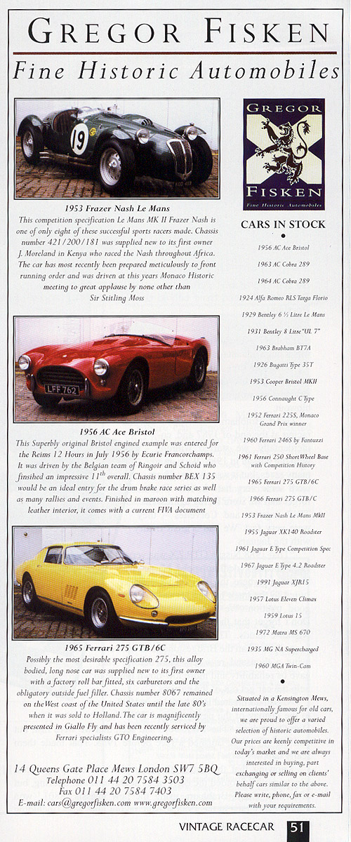 Great news from New Zealand and Honolulu! Robert Yung called from Honolulu with some details of his original and current ownership of a Mille Miglia, S/N 421/100/124. This was originally purchased by him in 1950 for east coast racing. When he moved on to Ferraris, it was sold to Bob Said. I saw the car when Ned Curtis owned it, before it went back to England to be restored. Mr.Yung noticed the car at an auction in England and bought it back a few years ago - great story! We hope to have some photos from Mr. Yung's initial ownership. Hall and Bradfield have a Mille Miglia on offer. A very nice looking car. See it on their website. As mentioned above, Mille Miglia 421/100/168 came back to life in New Zealand - see the web page on this restoration. It was a successful conclusion of a plan to finish this car in mid-February. Finally, sad news to report. Mille Miglia racer and owner Frank Twaits passed away in Virginia in late December, 2004. Frank provided invaluable advice on Frazer Nash cars and for this website. He will be greatly missed. Frank's car has gone back to England. News - 2004 As the year draws to a close, just a few new Frazer Nash-related items: The very last Le Mans Replica, which was the Vintage Racecar Journal featured car in April, 2001 (see below), returned to a new owner in England after nearly 50 years in the U.S. Next, Dragone Classic Motorcars (Connecticut, dragoneclassics.com) has a Le Mans Replica, "replica" advertised in the January 2005 issue of Hemmings Motor News. This is believed to be a car formerly registered as XME 253, built by Crosthwaite & Gardiner. We have a web page on these replica cars. The price is more than 50% of the last reported authentic LMR sale. Finally, there has been tremendous progress in New Zealand on my Frazer Nash Mille Miglia - it is now off to the paint shop and waiting for its U.S. billet crankshaft - a great conclusion to 2004! September was this web site's anniversary month - seven years on the Internet! And it's a milestone in the history of my Frazer Nash, a Mille Miglia model. Most of the external body and chassis work was completed in Arizona and the car is now in (far) southern New Zealand, in the final stages of restoration. I hope to sit in this car next February - for the first time - and drive to Christchurch to join the Frazer Nash "Raiders" on the second part of their drive through the country! The August 2004 issue of the "Chain Gang Gazette" had a great article on the Mille Miglia model (my car!) by James Trigwell. In June we returned from a great adventure - the Frazer Nash Raid to Scotland, Highlands and Islands" sponsored by the Frazer Nash Section. We joined the Raid two days after it started, on May 22 in Inveraray and continued on to two days in Mull, leaving the Raid group to tour the Loch Ness and "Whisky Trail" areas, winding up in Edinburgh then Glasgow. Alas, we only drove a Vauxhall Corsa for the nearly 600 miles (without mishap!), but Scotland was sunny, beautiful and great fun. Click here for too many photos, with more to follow. I never counted all the 'Nashes of the Raid, but there were several GNs, more than 20 chain-drive cars, two Frazer Nash-BMWs and one postwar model, a LeMans Replica. In March we had a very